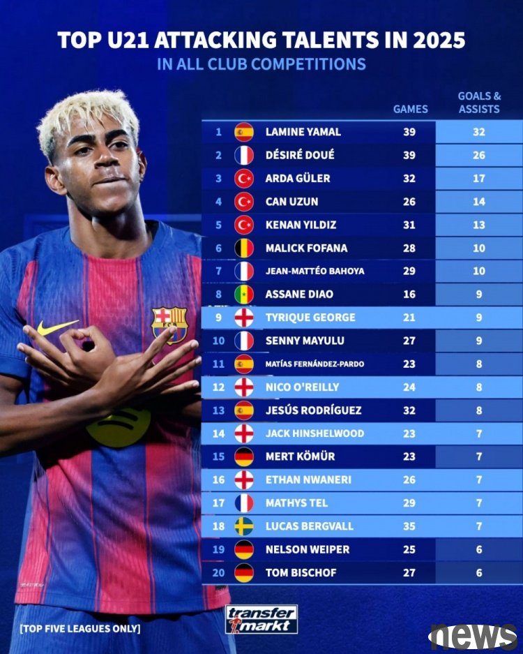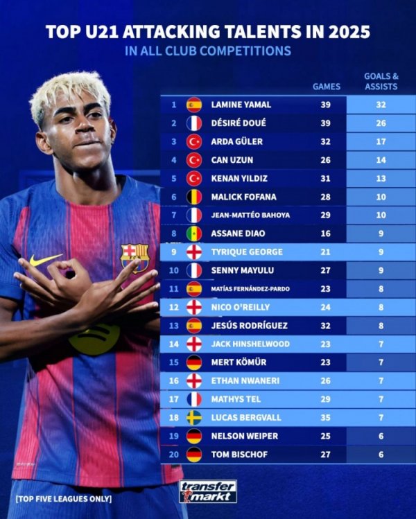The German transfer market lists the goals scored by U21 players in the five major leagues in 2025. Yamal leads the list with 32 goals, followed by Douai with 26 goals.