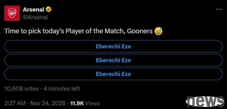 After the game, Arsenal officials released a vote on social media to select the best player of the game. The three options were all for Eze, who scored a hat trick.