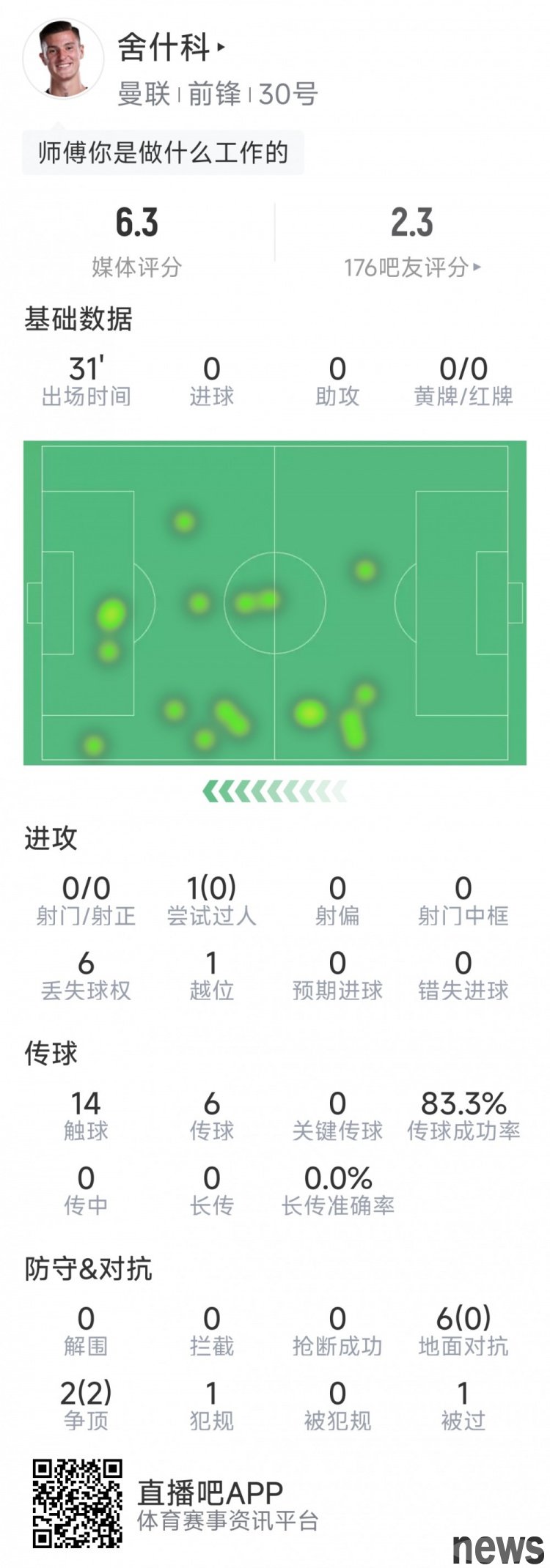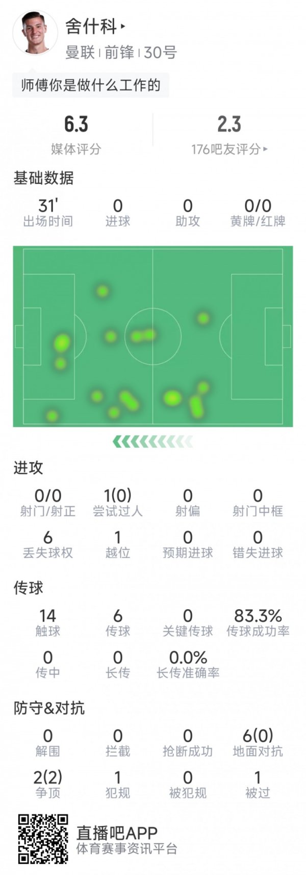 In this round of the Premier League match between Manchester United and Tottenham, Sheshko came on as a substitute in the 58th minute of the second half and was injured again in the 88th minute. The following are his statistics for this game: