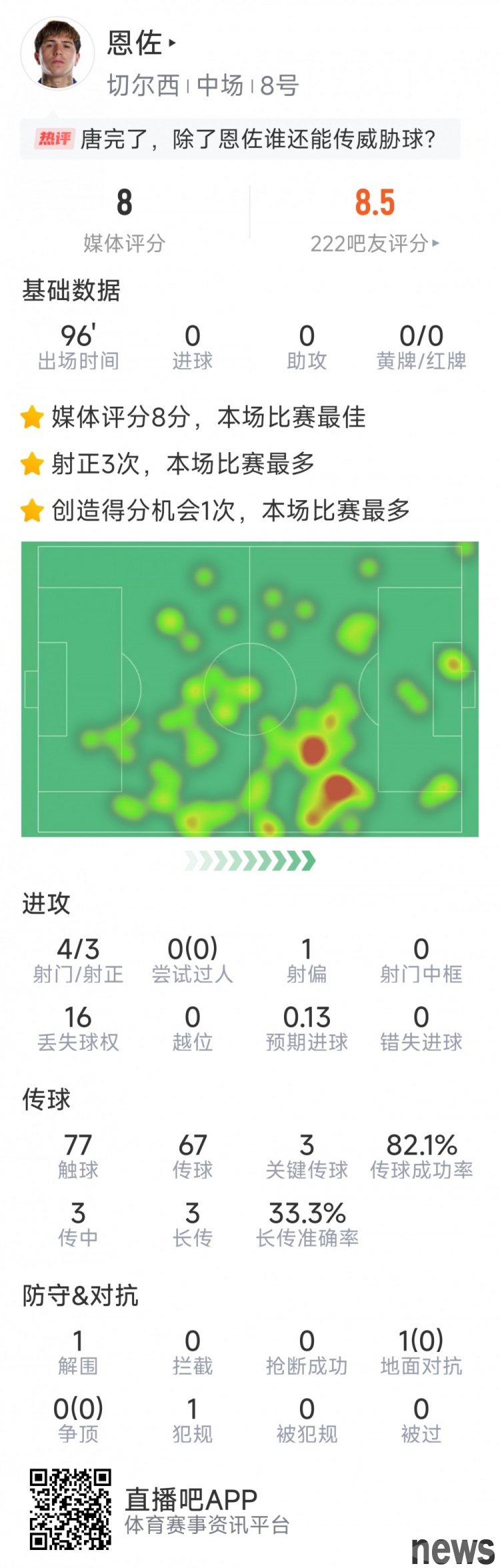 It s hard to save the defeat. Enzo s statistics for this game: 3 key passes, 4 shots and 3 goals, with a score of 8 points, the highest in the game.