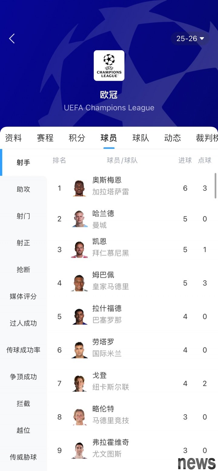 After the 4 rounds of the Champions League, Osimhen scored twice in the previous round and achieved a hat trick in this round. With 6 goals in 4 rounds, Osimhen temporarily topped the scorer list.
