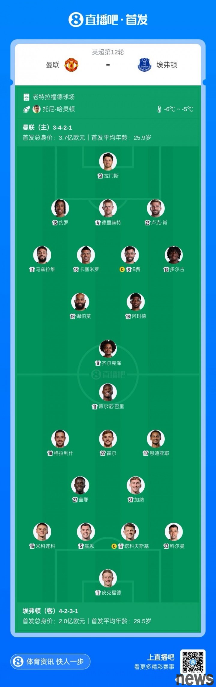 November 25th News The final contest of the 12th round of the Premier League, Manchester United vs. Everton at home is about to begin. Started before the game. Sheshko and Maguire were injured in this game, and Cunha was absent due to medical reasons. Shay Lacey is 18 years old and is a young winger in the Manchester United echelon.