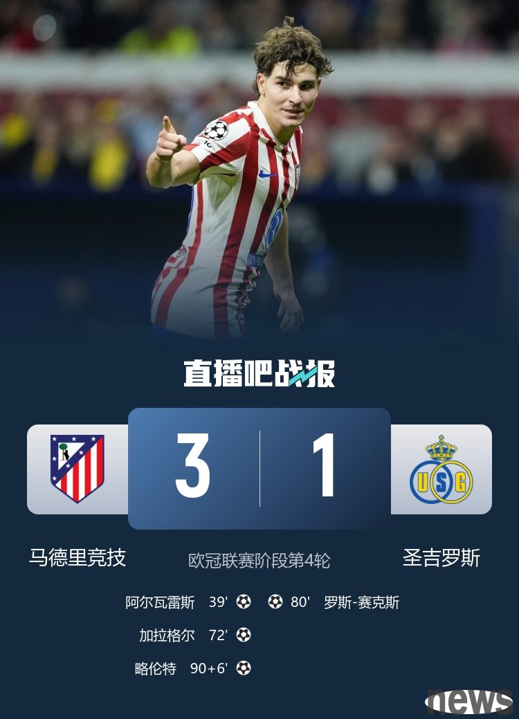 In the fourth round of the Champions League stage, Atletico Madrid defeated San Giros 3-1, Alvarez and Gallagher scored.
