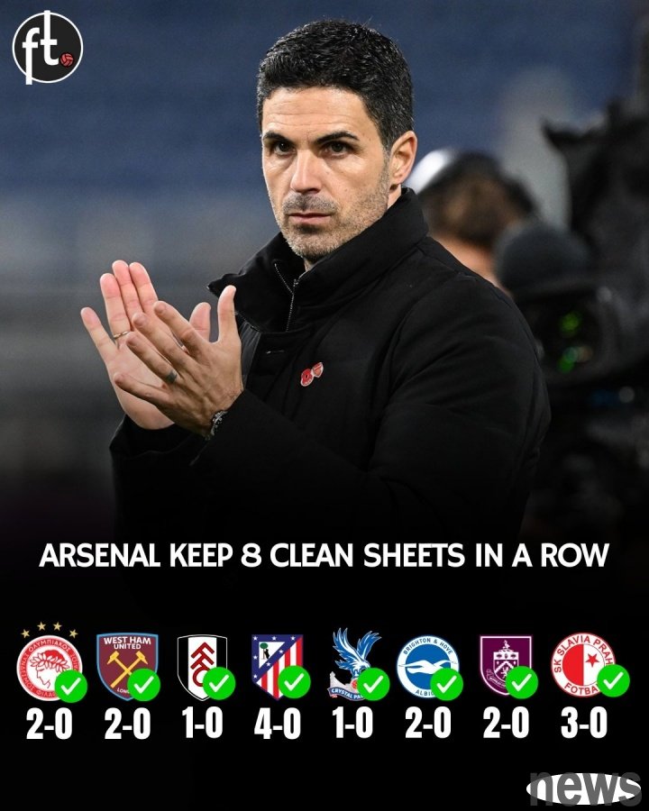 The Gunners have now won ten consecutive games in all competitions and achieved 8 consecutive games with a clean sheet. According to statistics, Arsenal tied the club's longest clean sheet record (8 games) set in 1903.