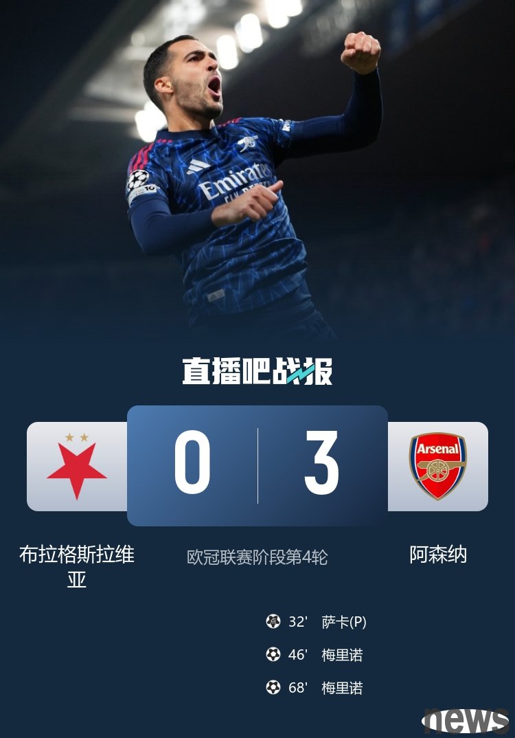 In the fourth round of the UEFA Champions League, Merino scored twice, Saka scored, and Arsenal defeated Slavia Prague 3-0.