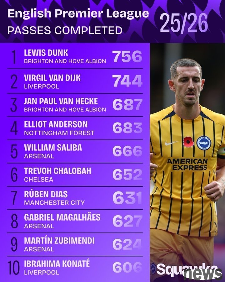 Premier League successful passes list this season: Van Dijk is second, only Anderson and Souwemendi are the midfielders